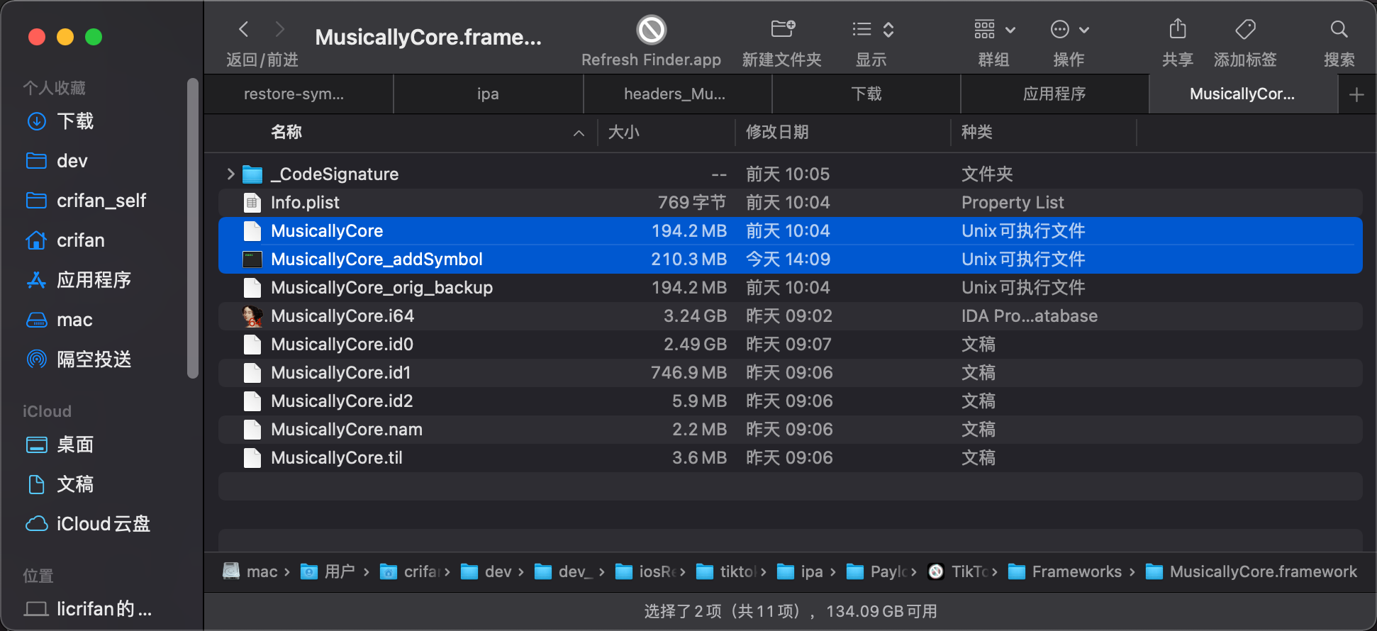 crifan@licrifandeMacBook-Pro ~/dev/dev_src/ios_reverse/symbol/restore-symbol/HeiTanBc/restore-symbol master ./restore-symbol /Users/crifan/dev/dev_root/iosReverse/tiktok/ipa/Payload/TikTok.app/Frameworks/MusicallyCore.framework/MusicallyCore -o /Users/crifan/dev/dev_root/iosReverse/tiktok/ipa/Payload/TikTok.app/Frameworks/MusicallyCore.framework/MusicallyCore_addSymbol